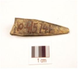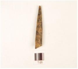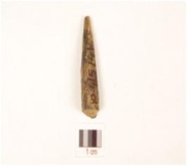 | Description / विवरण | Fragment of a bone point with broken tip, other end also broken, rectangular cross section, smooth surface and black surface due to heat treatment. |