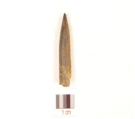 | Description / विवरण | Fragment of a bone point circular cross section, pointed tip and other end broken, smooth surface and surface black due to heat treatment. |