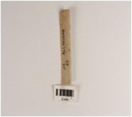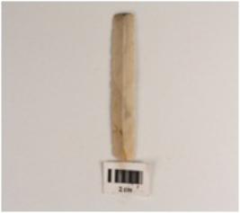 | Description / विवरण | Chert blade with a mid-ridge on dorsal side, use-wear marks along the cutting edges, triangular in section. |