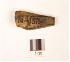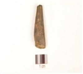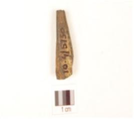 | Description / विवरण | Fragment of a bone point plano convex cross section, pointed tip and surface black due to heat treatment. |