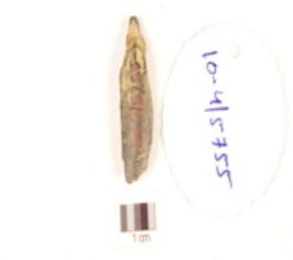 | Description / विवरण | Fragment of a bone point with both ends broken, one side smooth and surface black due to heat treatment. |