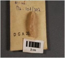 | Description / विवरण | Quartz point with a pointed distal end, flake scars visible, part of cortex also visible. |