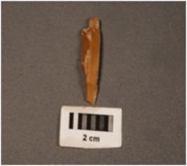 | Description / विवरण | Blade mae on chert, prominent mid ridge on dorsal. Triangular in section and diffused bulb on ventral side. |