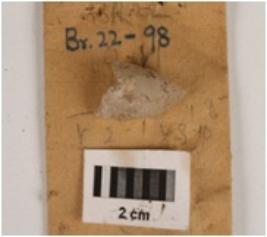 | Description / विवरण | Fragment of quartz core, one end broken, shape ridges, three blade scars visible. |