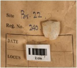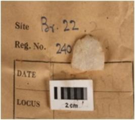 | Description / विवरण | Fragment of a quartz flake, rectangular in section, diffused bulb on ventral side, strick marks on surface. |