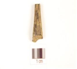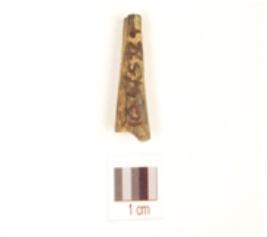 | Description / विवरण | Fragment of a bone point with oval cross section, broken tip, smooth surface and surface black due to heat treatment. |