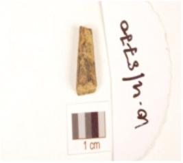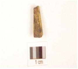 | Description / विवरण | Fragment of a bone point with circular cross section, smooth surface, broken tip, broken at other end and black surface due to heat treatment. |