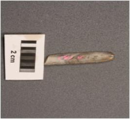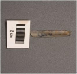 | Description / विवरण | Parallel-sided microlith blade with mid ridge on dorsal. triangular in section, and diffused bulb on proximal end. |