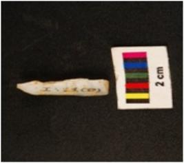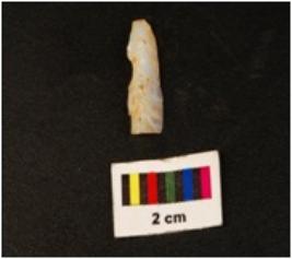 | Description / विवरण | Blade with use wear mark on one side, other side slightly chipped off. Ridge visible on dorsal surface, positive bulb on ventral side of proximal end, distal end broken. |