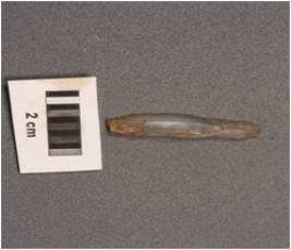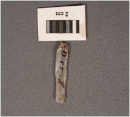 | Description / विवरण | Parallel sided chalcedony blade, mid ridge on dorsal, use wear on edge, diffused bulb on proximal end. |