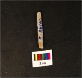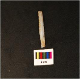 | Description / विवरण | Paralled sided microlithic blade with two ridges on dorsal side, trapezoidal in section, diffused bulb on ventral side, broken at distal end and use wear marks on cutting edges. |