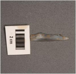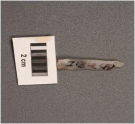 | Description / विवरण | Parallel sided blade with use-wear marks on cutting edges and prominent mid-ridge on dorsal, diffused bulb on ventral side, both ends are broken. |