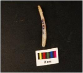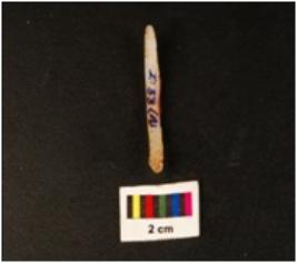 | Description / विवरण | Parallel sided microlith blade with prominent mid ridge on dorsal and use wear marks on cutting edges. Triangular in section and diffused bulb on ventral side. |