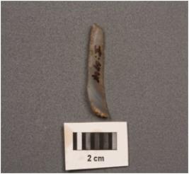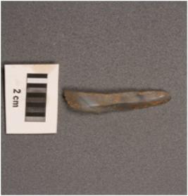 | Description / विवरण | Parallel sided blade with use-wear marks on cutting edges and prominent mid-ridge on dorsal side, diffused bulb on ventral side, triangular in section. |