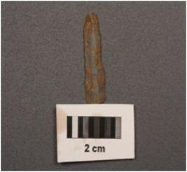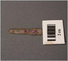 | Description / विवरण | Parallel-sided microlith blade with double ridges on dorsal. Bulb on ventral side, trapezoid in section and use-wear marks on cutting edges. |