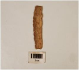 | Description / विवरण | A chert blade with two ridges on dorsal side, trapezoidal in section, distal end broken, use-wear marks along the cutting edges. |