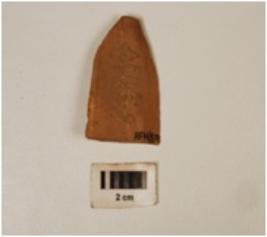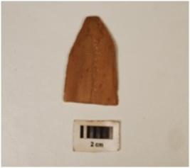 | Description / विवरण | A chert blade with mid-ridge on dorsal side, triangular in section, diffused bulb on ventral side, prepared platform, use-wear marks along the cutting edges, distal end broken. |
