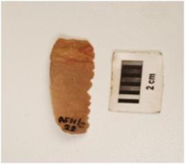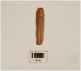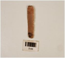| Description / विवरण | A chert blade with mid-ridge on dorsal side, diffused bulb on ventral side, use-wear marks along the cutting edges, both end broken, triangular in section. |