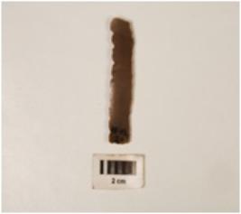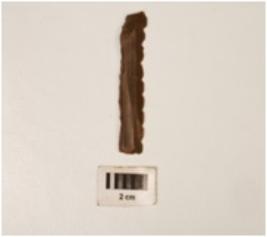 | Description / विवरण | A chert blade with two-ridges on dorsal side, both ends broken, regular re-touched along the cutting edges, trapezoidal section. |