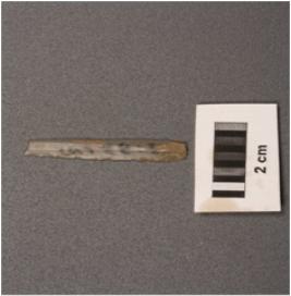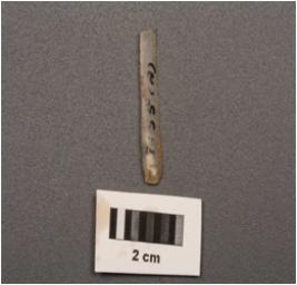 | Description / विवरण | Parallel sided microlithic blade with double ridges on dorsal and bulb on proximal end. Trapezoidal section and use wear marks on cutting edges. Broken at distal end. |