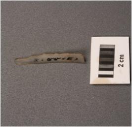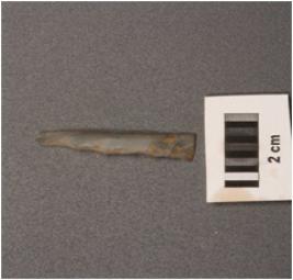 | Description / विवरण | Microlithic blade with mid ridge and blunt cutting edge on left dorsal. Bulb on proximal end. |