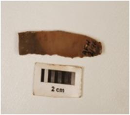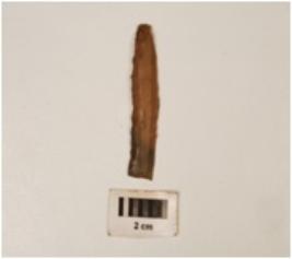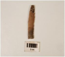 | Description / विवरण | A chert blade with two-ridge on dorsal side, trapezoidal in section, use-wear marks along the cutting edge, prepared platform and distal end broken. |