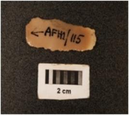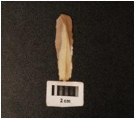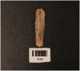 | Description / विवरण | A chert blade with mid-ridge on dorsal, prepared platform, triangular in section and use-wear marks along the cutting edges. |