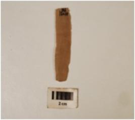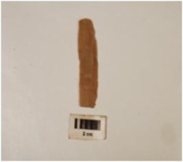 | Description / विवरण | A chert blade with two-ridges on dorsal side, trapezoidal in section, both ends broken, use-wear marks along the cutting edges. |