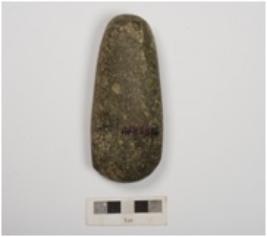 | Description / विवरण | A celt, made on basalt, polished surface with a flat broad working edge at one end and other end is spherical, thick and heavy slightly chipped off at working edge. |