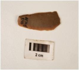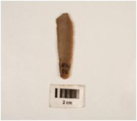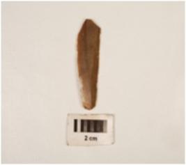 | Description / विवरण | A chert blade with two-ridges on dorsal side, distal end broken, trapezoidal in section, use-wear marks along the cutting edges. |