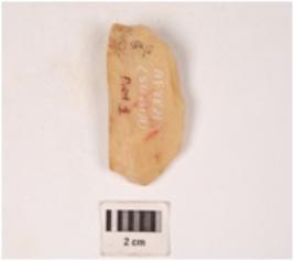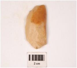 | Description / विवरण | A quartzite stone side scrapper, made on end struck blade, prepared platform, diffused bulb on ventral surface, irregular retouch at cutting edge. |