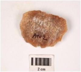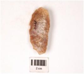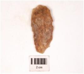 | Description / विवरण | A side scraper made on end struck flake, diffused bulb on ventral surface, irregular retouch at cutting edge. |