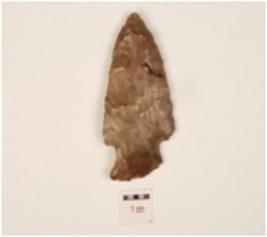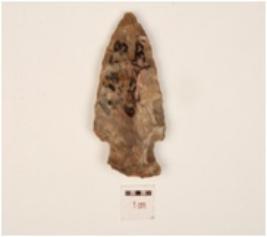 | Description / विवरण | Arrowhead made of chert, triangular shaped retouched edges, tanged and barbed. |