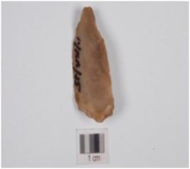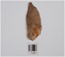 | Description / विवरण | End stuck utilized flake made on chart, triangular cross-section and cartex partly intact, use-marks along cutting edge. |
