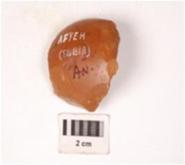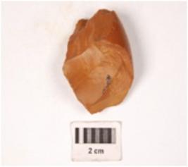 | Description / विवरण | A chert stone scrapper on core, six blade detached from it, diffuse bulb at ventral surface, irregular retouch at cutting edge. |