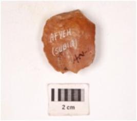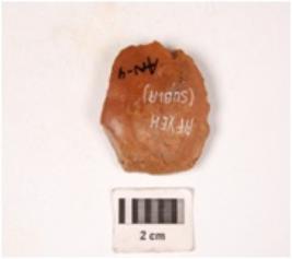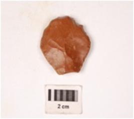 | Description / विवरण | A chert stone side scraper prepared platform at proximal end, diffused bulb at ventral surface, irregular retouch at cutting edge. |