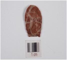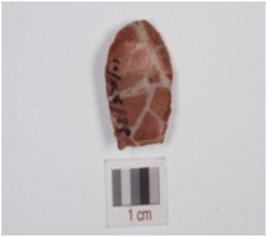 | Description / विवरण | Point made on chert, prominent bulb on vertical side, tip broken and retouched edges. |