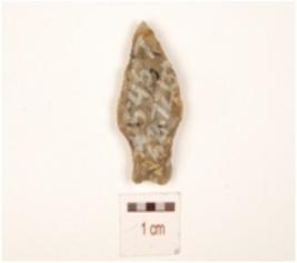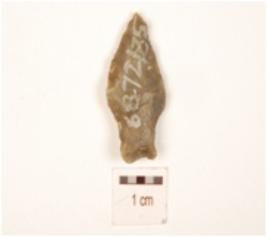 | Description / विवरण | Arrowhead made of chert, triangular in shape, retouched edges, tanged and barbed. |
