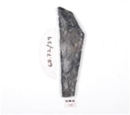 | Description / विवरण | A sickle made of chert, both ends partly broken and retouched edges. |