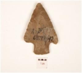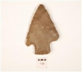 | Description / विवरण | Arrowhead made of chert, triangular shaped, retouched edge, tanged and barbed. |