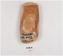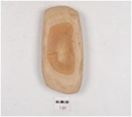 | Description / विवरण | A chert axe , convex sharp cutting edges on both the ends, polished surface and oval cross-section. |