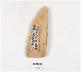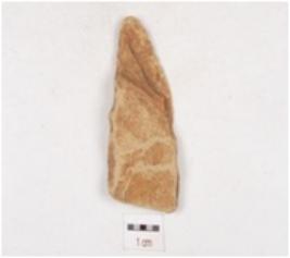 | Description / विवरण | A side struck utilized flake, made of chert, prepared platform, diffused bulb on ventral side and use-wear marks along sharp edge. |