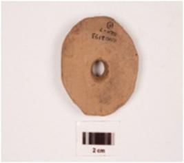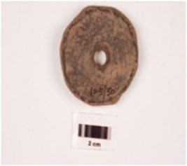 | Description / विवरण | A wheel made spindle whorl with an hour glass perforation at the centre, made on potsherd, it is made with fine clay and surface covered in black slip. |