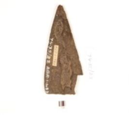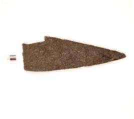 | Description / विवरण | A copper arrow axe triangular shape with rectangular cross section, one end broad and broken another end pointed encrustation on the surface. |