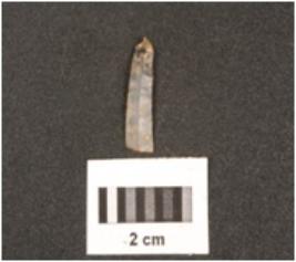 | Description / विवरण | Fragment of parallel sided chalcedony blade with use-wear marks on cutting edges, a mid-ridge on dorsal side and diffused bulb on ventral side. |