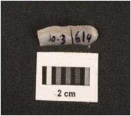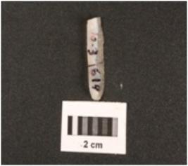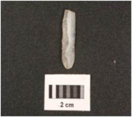 | Description / विवरण | Fragment of chalcedony blade with use-wear marks on cutting edges, mid ridge on dorsal, triangular in section and prominent bulb on ventral end. |