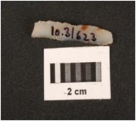 | Description / विवरण | Fragment of parallel sided chalcedony blade with use-wear marks on cutting edges, mid-ridge on dorsal and diffused bulb on ventral side. |