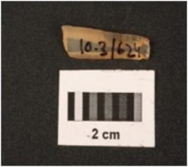 | Description / विवरण | Fragment of chalcedony blade, two-ridge on dorsal side, diffused bulb on ventral, sharp cutting edges. |