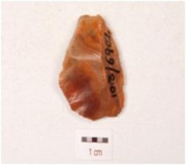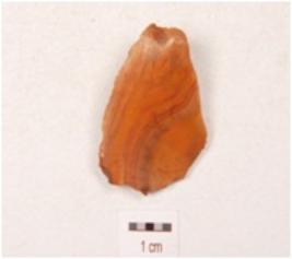 | Description / विवरण | A side scraper made on chert flake with prepared platfrom and prominent bulb on the ventral surface, use ware marks along the cutting edges, broken at distal end. |