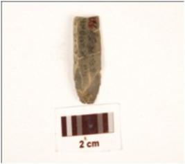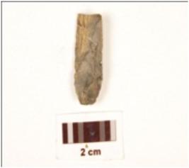 | Description / विवरण | Blade, made on chert with single ridge on dorsal side, triangular in section and use wear marks on cutting edge. |